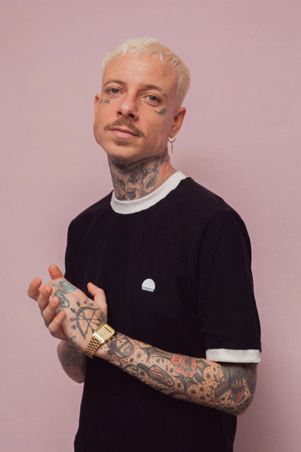 Camiseta com modelagem unissex, manga curta com acabamento de ribana, costura com reforço nos ombros e gola branca canelada (ver detalhe na foto)