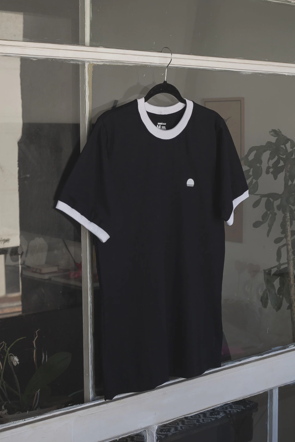 Malha penteada Fio 30.1 - 100% Algodão com encolhimento mínino, na cor PRETA; acabamento de ribana na cor BRANCA, canelada com 3cm de largura nas mangas e na gola.
